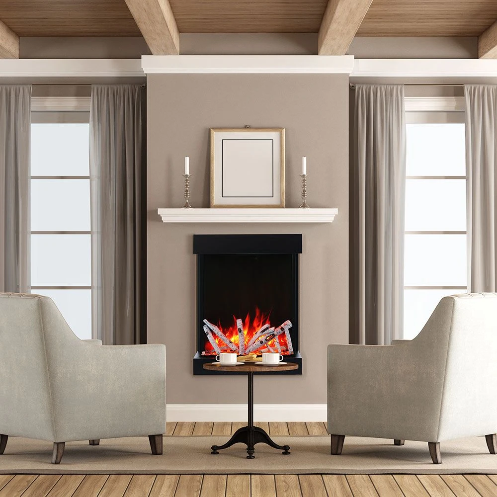Amantii 2939-TRU-VIEW-XL Tru-View Series 3-Sided 29-Inch Indoor/Outdoor Electric Fireplace with Logs provides a premium alternative to a wood or gas fireplace. This stylish electric fireplace features an innovative three-sided design for impressive viewing at any angle. The 2939 XL features two flame sets as well as ambient lighting in adjustable colors for a personalized firebox appearance. This fireplace can be further customized with the included 10-piece log set, charcoal gray fire glass media and two bags of vermiculite to enhance the flame presentation. Additional features such as an integrated 5,000 BTU heater and remote control add to an already impressive package. Approved for both indoor and outdoor use, this fire feature can enhance almost any living space. In addition, WiFi enabled Smart technology allows supreme flexibility, letting you control the fireplace from your smartphone.