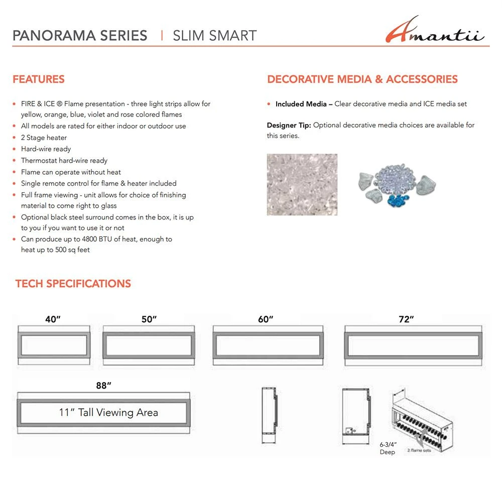 Amantii Panorama Slim Built-In Smart Electric Fireplace provides a premium heating alternative to a wood or gas fireplace. The Panorama Slim series is an instant upgrade for any space. The adjustable ambient LED canopy lighting adds a captivating touch to your room, while the cutting-edge flame presentation allows for effortless color changes. Enhance the flames with the included clear fire glass and ICE media kit. Additional features such as an integrated 5,000 BTU heater and remote control add to an already impressive package. Furthermore, with the convenience of WiFi-enabled Smart technology, you can have ultimate control over the fireplace right from your smartphone. Enjoy the comfort of a fireplace without the hassle and cost of gas or wood when you add an Amantii electric fireplace to your home.