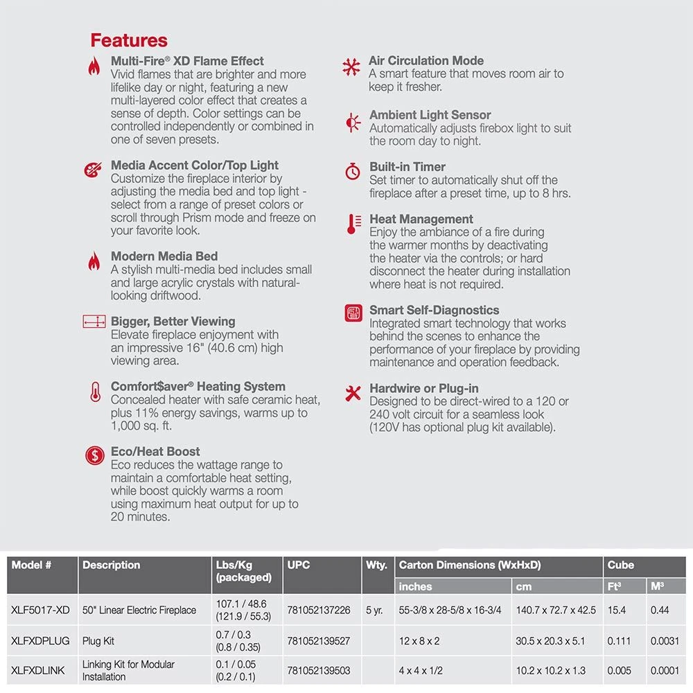 Dimplex XLF5017-XD IgniteXL Bold Deep Built-In Linear Electric Fireplace, 50-Inch provides a high quality, modern hearth option to improve your favorite living space. A patented mirror effect offers incredible visual depth to offer a realistic flame presence with the illusion of a real burning fire, and the multi-media bed uses two sizes of crystals and driftwood logs to complete the look. Multi-color accent lighting make it a breeze to customize the look of your Dimplex electric fireplace, and the integrated heater can provide up to 8,530 BTU when the fireplace is connected directly to your home’s 240V system. The included multi-function remote control provides an easy way to operate the flames and heater independently in order to offer year round use without the need for any venting or other requirements.