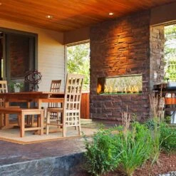 Firegear Kalea Bay Linear See-Through Outdoor Gas Fireplace with LED Lights, 60-Inch provides a contemporary outdoor fire feature to enhance any patio space. This impressive fireplace features a heavy duty 304 stainless steel firebox and burner construction to ensure a long lasting and durable product to withstand the elements. This unit requires no special venting thanks to its clean design, allowing for an easier installation–just frame and finish. An integrated electronic ignition system offers on/off and high/low flame options. This system features intermittent and continuous pilot options for flexible use, while optional controls are available to further enhance the system (sold separately). The unit comes designed as a 1-sided fireplace, but is converted to a see-through appliance with an included conversion kit. The included tempered glass windshield helps protect the flame in windy conditions and helps complete the modern aesthetic of this premium fire feature.